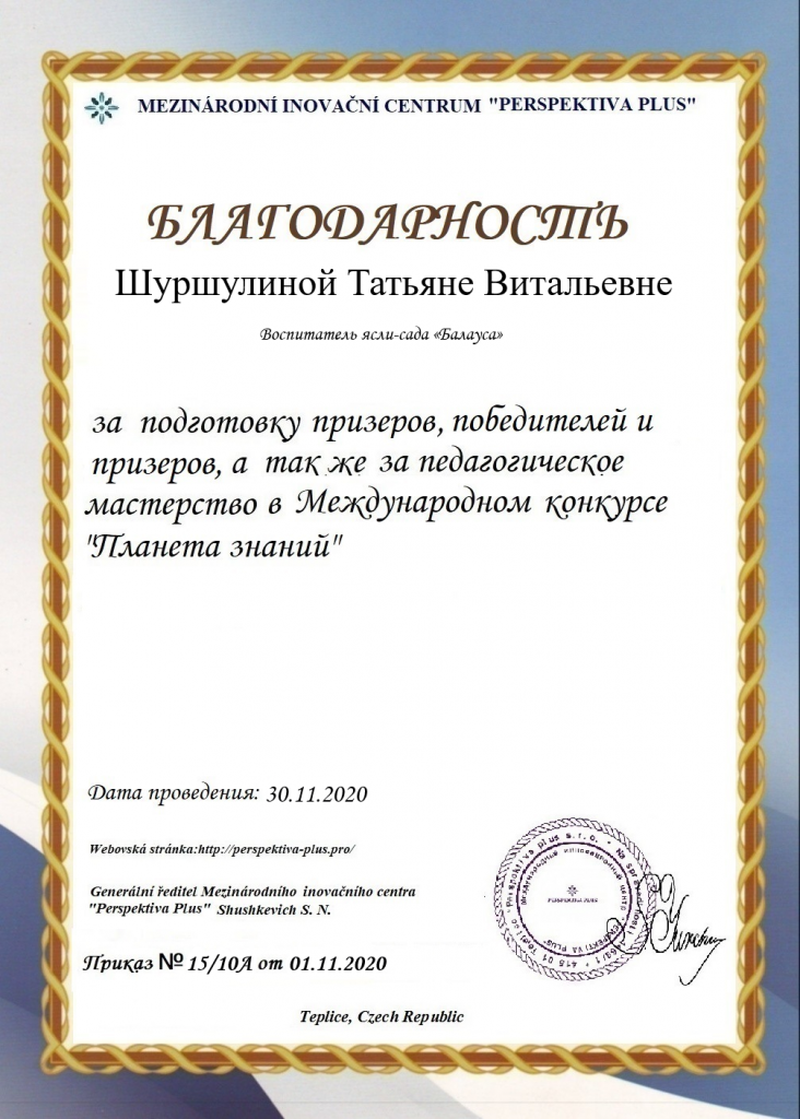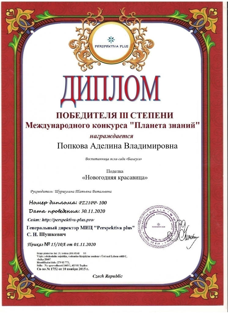 Балауса Бөбекжай-бақшаның тәрбиешісі Аделина Попкованы «Планета знаний» халықаралық байқауында III орын жеңгенімен құттықтаймыз!